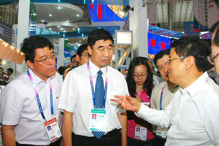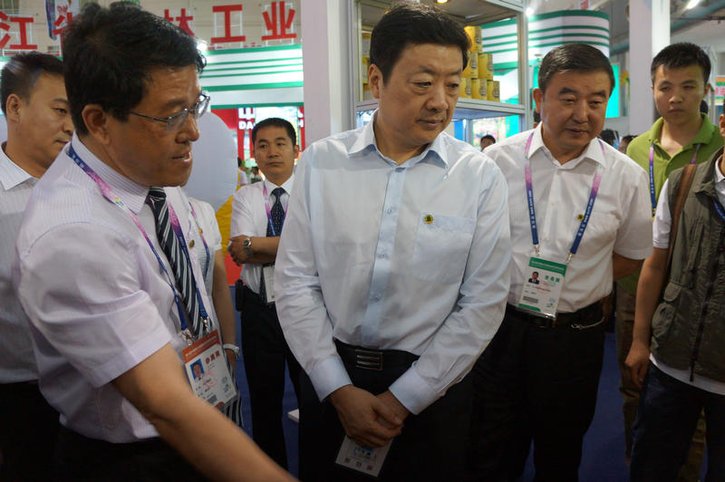 黑龍江省副省長呂維峰(右一)來到哈洽會北大荒米業(yè)展位,勉勵企業(yè)要打綠色牌,