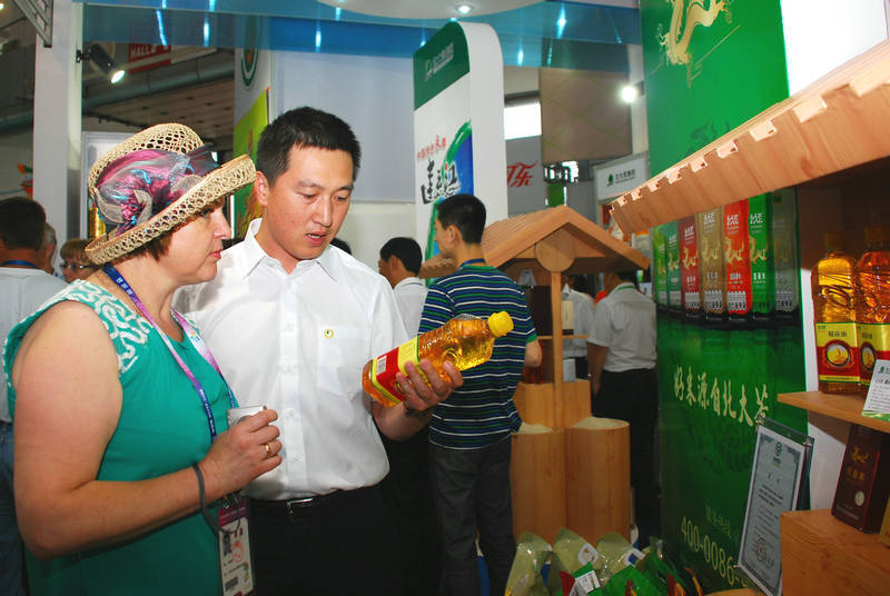 在哈洽會北大荒米業(yè)展位,俄羅斯客商對企業(yè)的稻谷油產(chǎn)品產(chǎn)生了濃厚的興趣