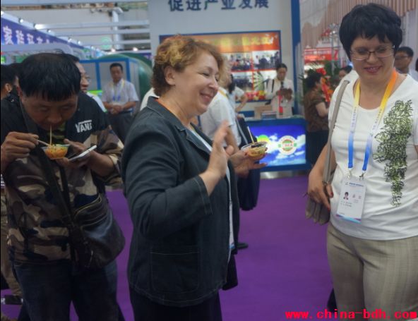 本次展會由米業(yè)集團(tuán)吉林公司承辦,在開幕的第一天,米業(yè)展區(qū)儼然成為一間百姓家中的廚房,吉林公司副總經(jīng)理謝連云親自用北大荒自產(chǎn)的秋田小町大米做成壽司,以供前來參觀的國內(nèi)外消費者品鑒。同時在吉林公司總經(jīng)理孟凡軍帶領(lǐng)下,推出的特色產(chǎn)品還有北大荒集團(tuán)新品大米面條,現(xiàn)場冷水下鍋,出鍋后分別做成冷面和拌面,深受廣大中外參展人員的喜愛。營銷部部長李丹峰也一直忙碌在展會現(xiàn)場洽談銷售。