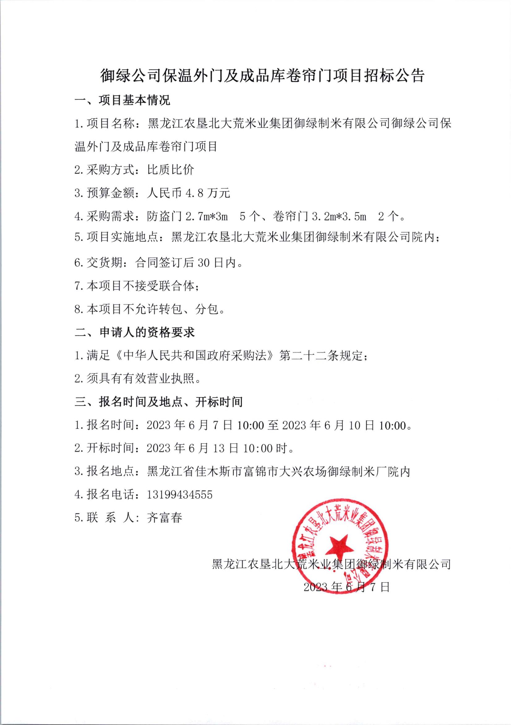 御綠公司保溫外門及成品庫(kù)卷簾門項(xiàng)目招標(biāo)公告