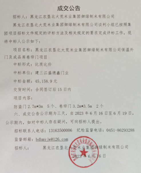 北大荒米業(yè)御綠公司保溫外門及成品庫(kù)卷簾門成交公告