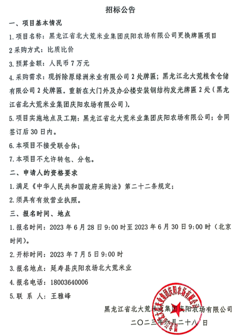 黑龍江省北大荒米業(yè)集團(tuán)慶陽農(nóng)場有限公司更換牌匾項目招標(biāo)公告