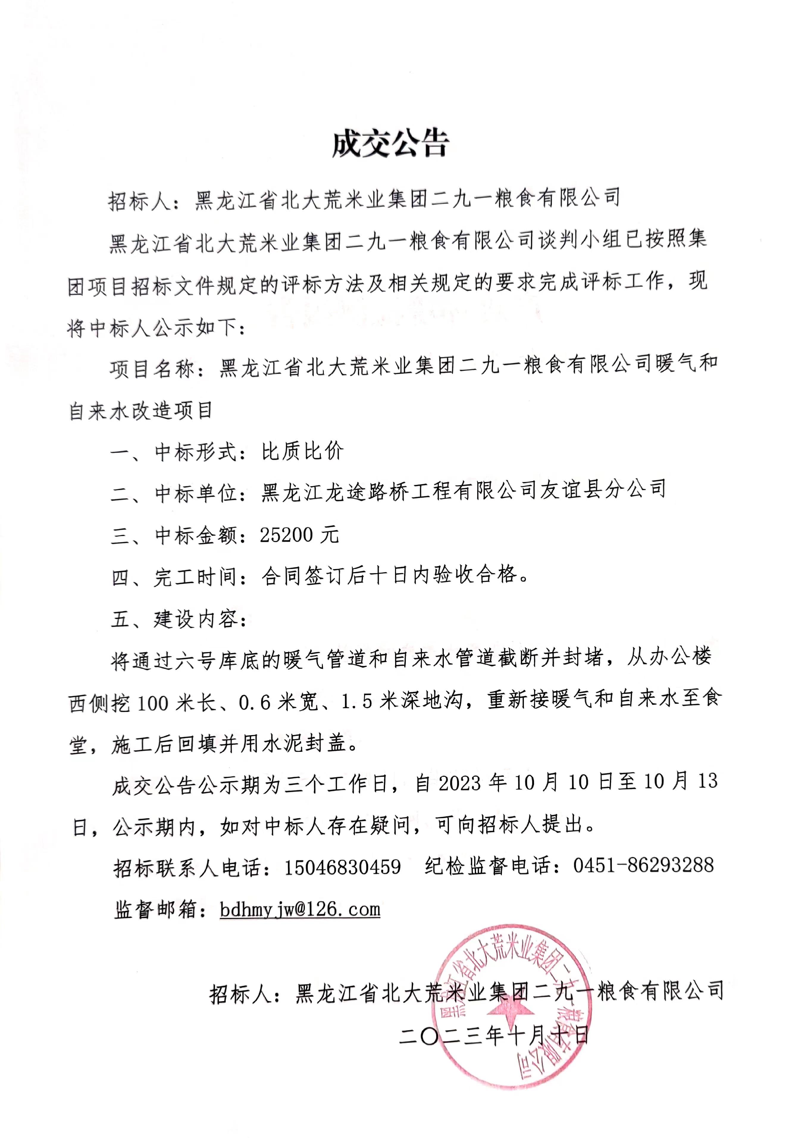黑龍江省北大荒米業(yè)集團(tuán)二九一糧食有限公司暖氣和自來水改造項目成交公告