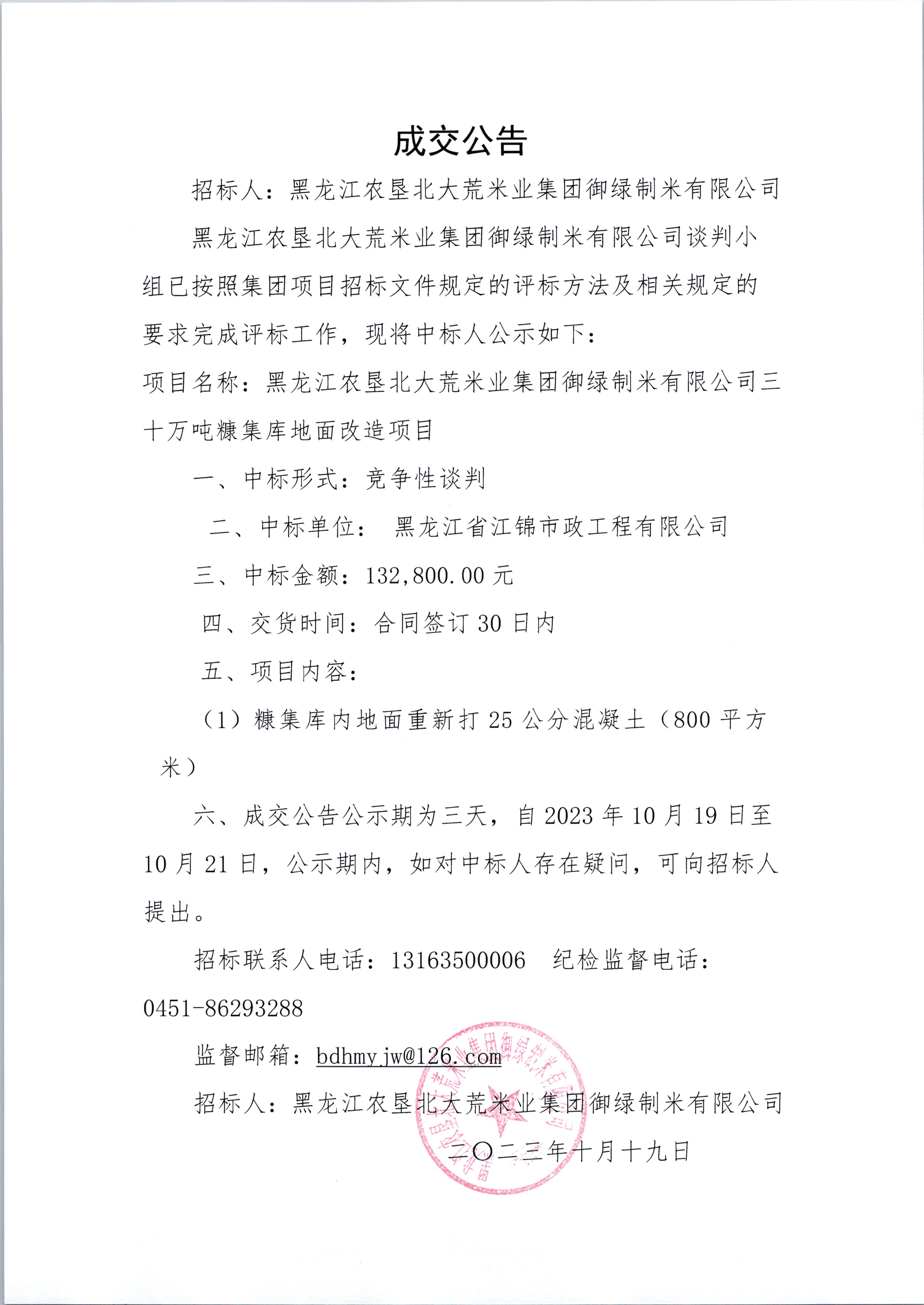 黑龍江農(nóng)墾北大荒集團御綠制米有限公司三十萬噸糠集庫地面改造項目成交公告