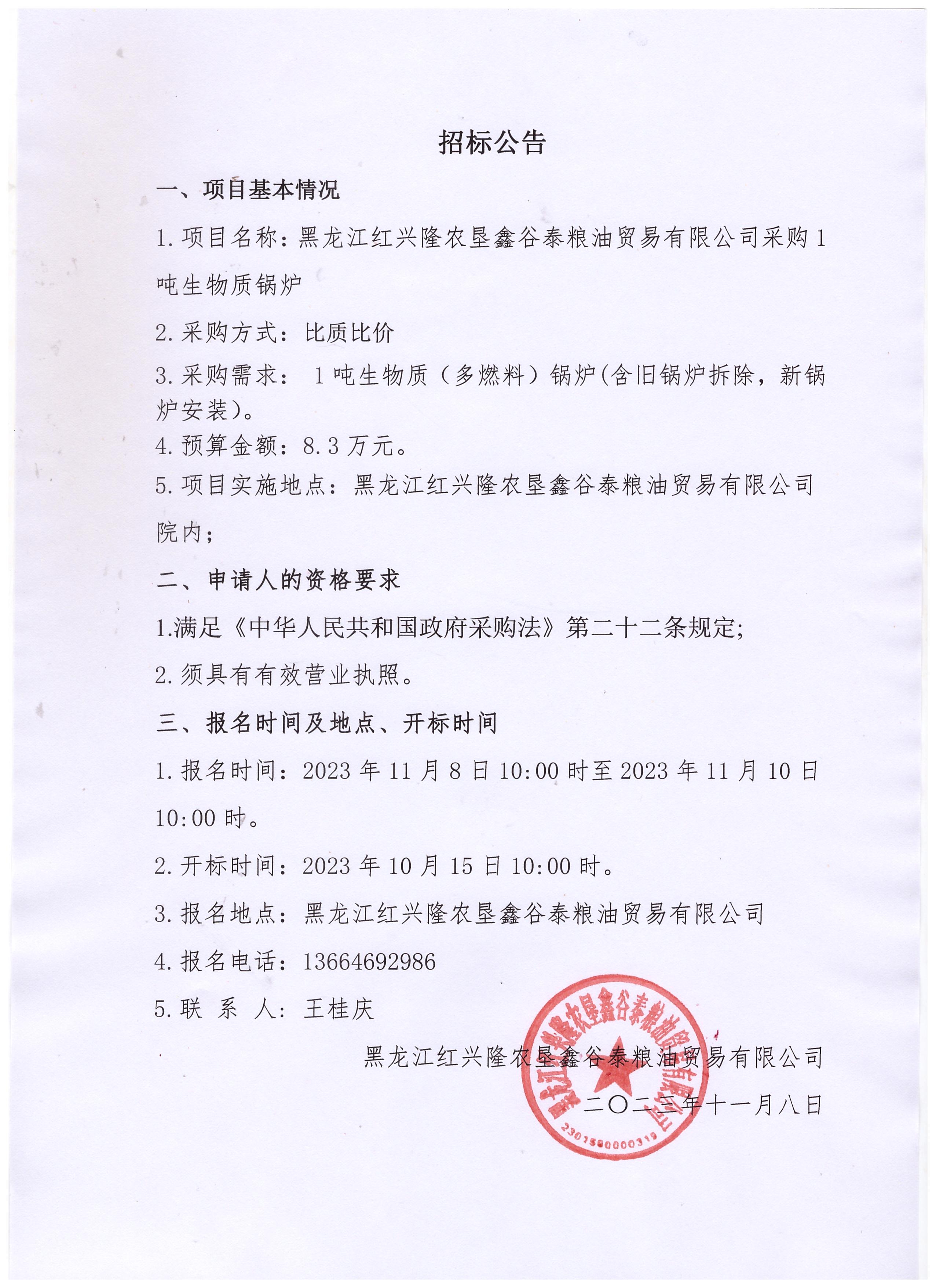 黑龍江紅興隆農(nóng)墾鑫谷泰糧油貿(mào)易有限公司采購(gòu)1噸生物質(zhì)鍋爐招標(biāo)公告