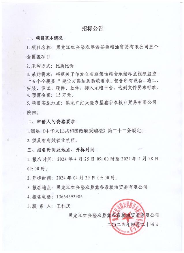 黑龍江紅興隆農(nóng)墾鑫谷泰公司五個全覆蓋項目招標公告