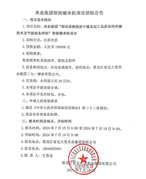 米業(yè)集團“稻谷原糧保質(zhì)干燥及加工品質(zhì)協(xié)同關(guān)鍵技術(shù)及節(jié)能裝備研制”智能碾米機項目招標(biāo)公告