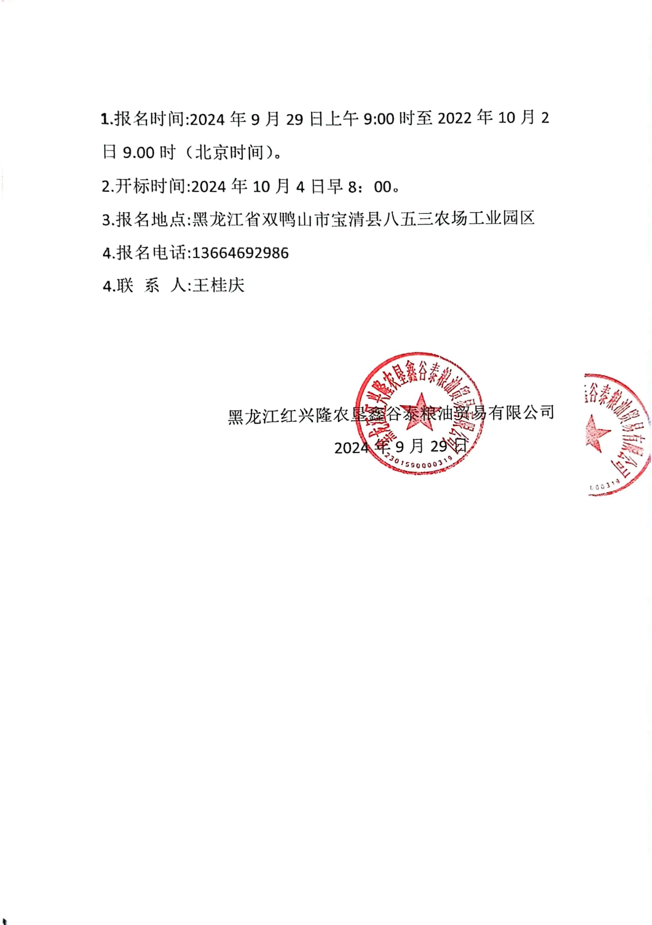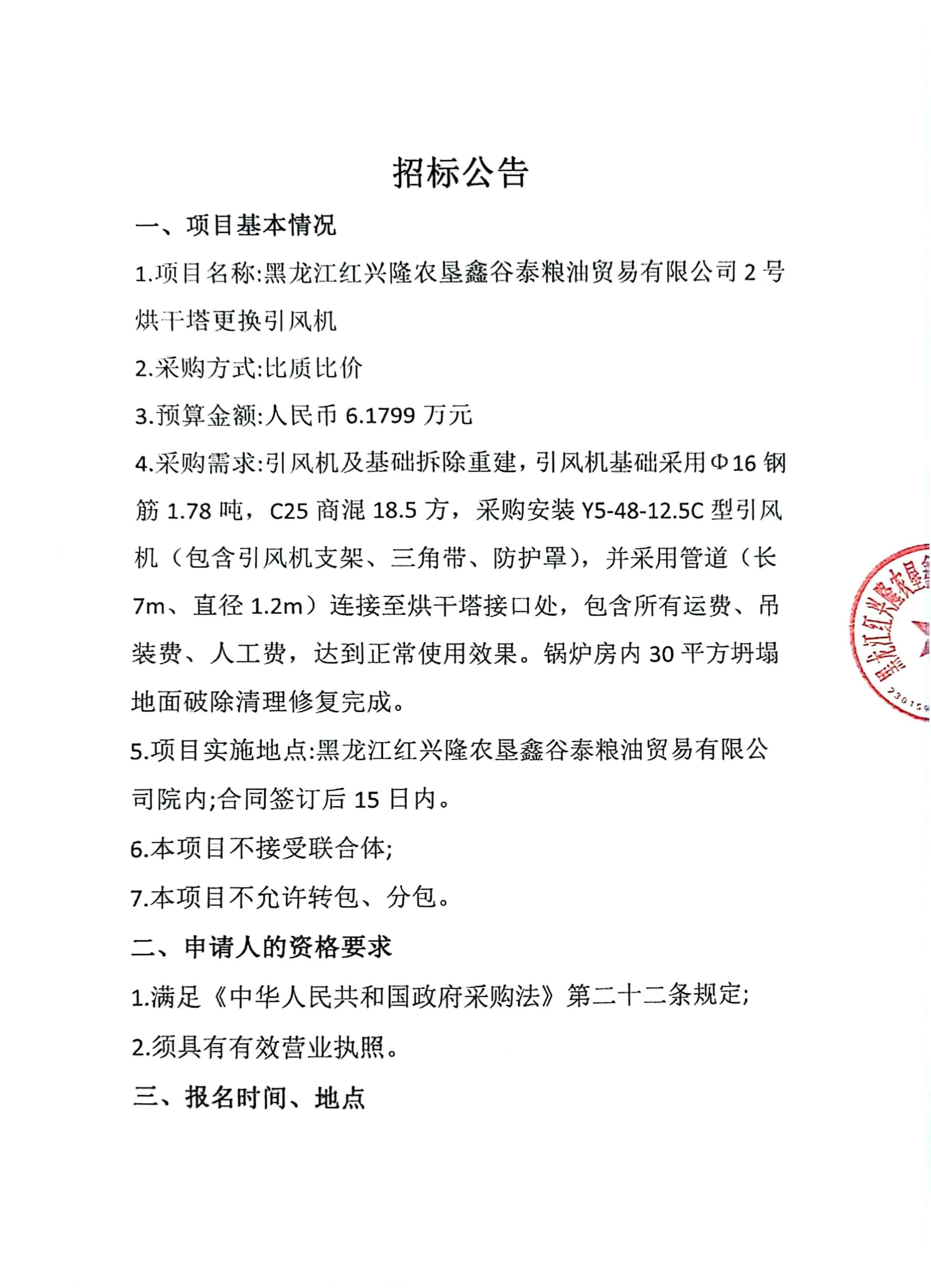 黑龍江紅興隆農(nóng)墾鑫谷泰糧油貿(mào)易有限公司2號烘干塔更換引風(fēng)機招標(biāo)公告