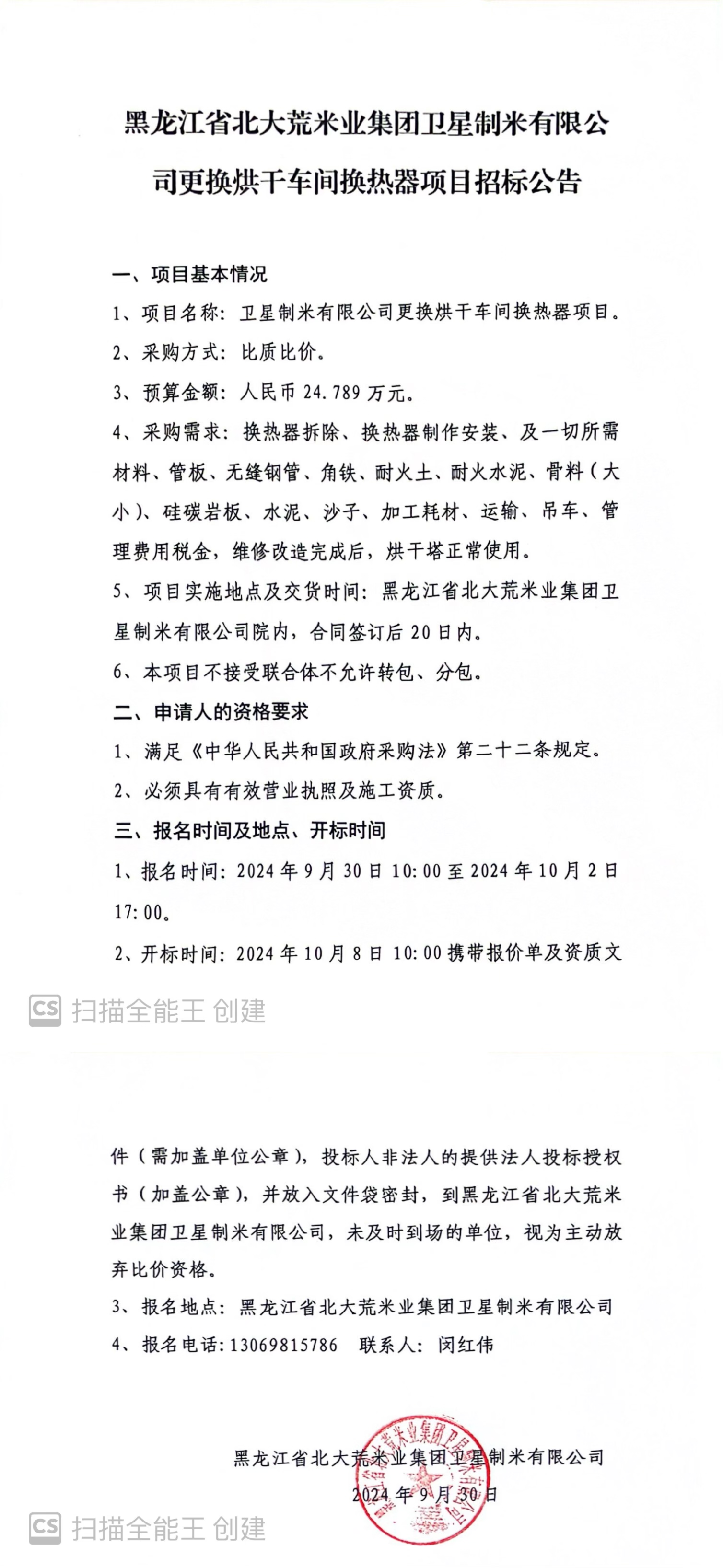 衛(wèi)星制米有限公司更換烘干車間換熱器項目招標(biāo)公告