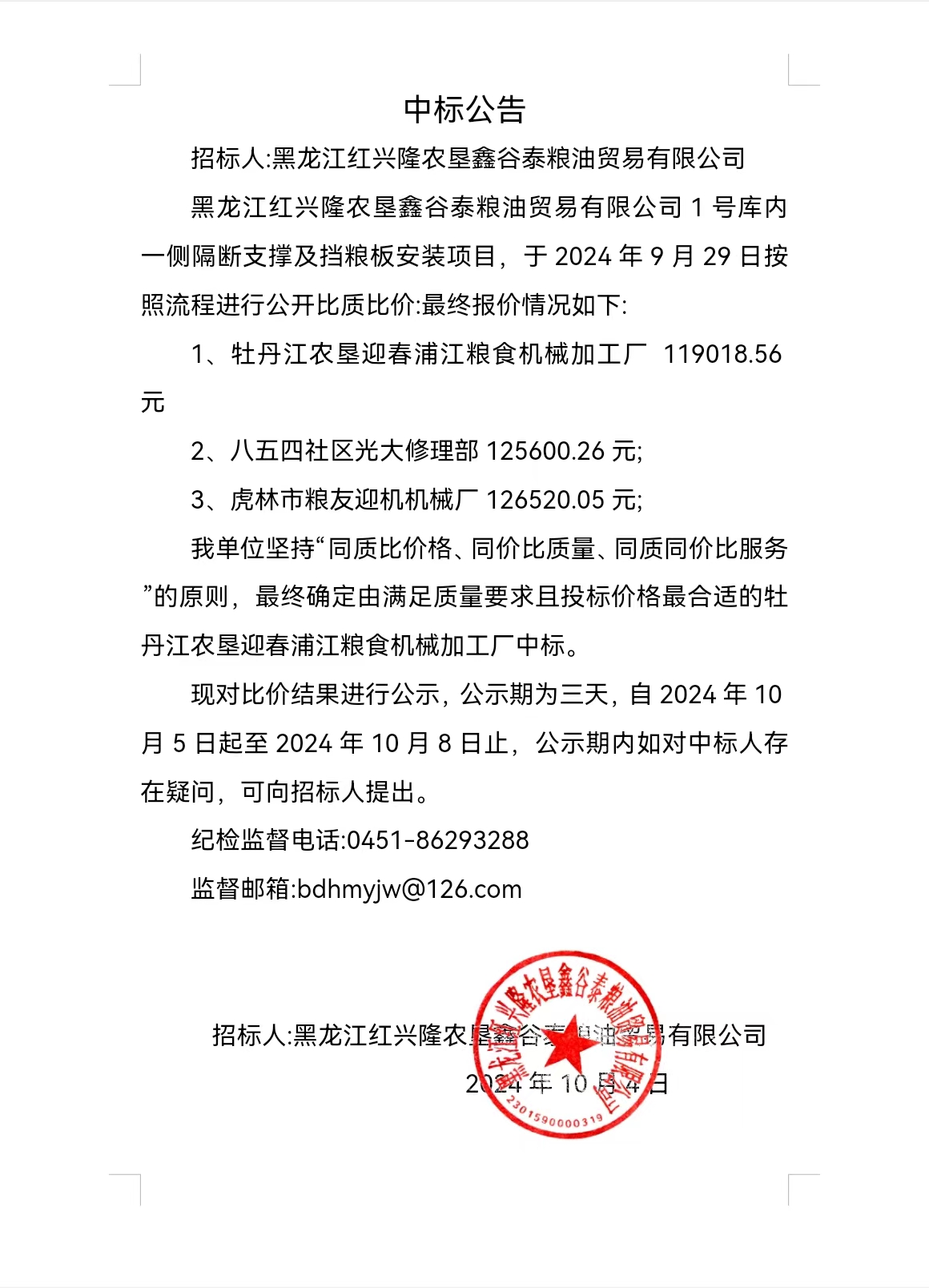 鑫谷泰糧油公司1號(hào)庫(kù)隔斷支撐及擋糧板項(xiàng)目中標(biāo)公告