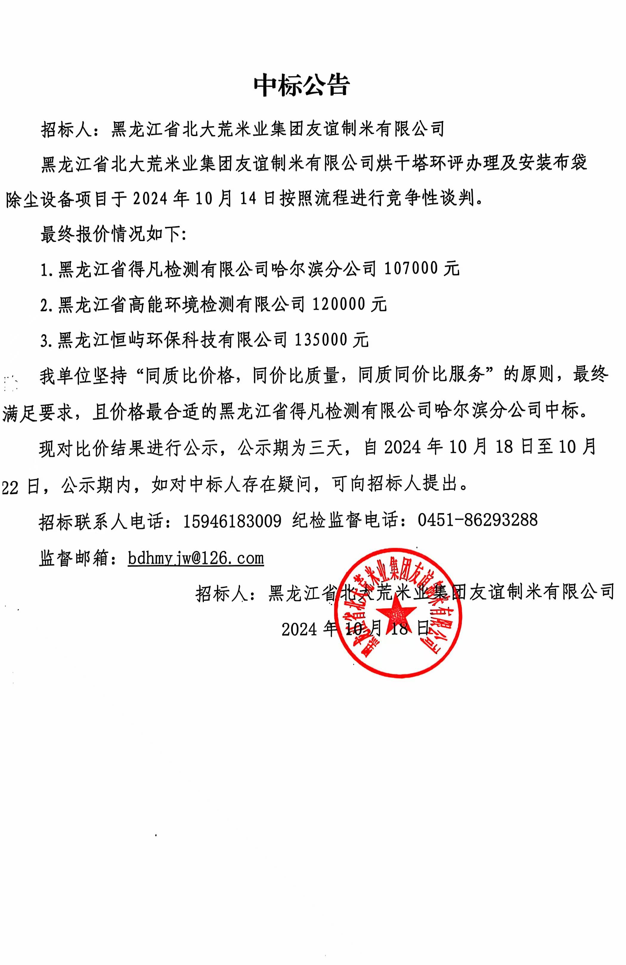 友誼制米有限公司烘干塔環(huán)評辦理及安裝布袋除塵設(shè)備項(xiàng)目中標(biāo)公告