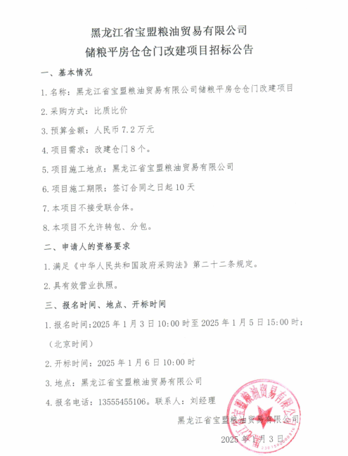 黑龍江省寶盟糧油貿(mào)易有限公司儲(chǔ)糧平房倉(cāng)倉(cāng)門(mén)改建項(xiàng)目招標(biāo)公告