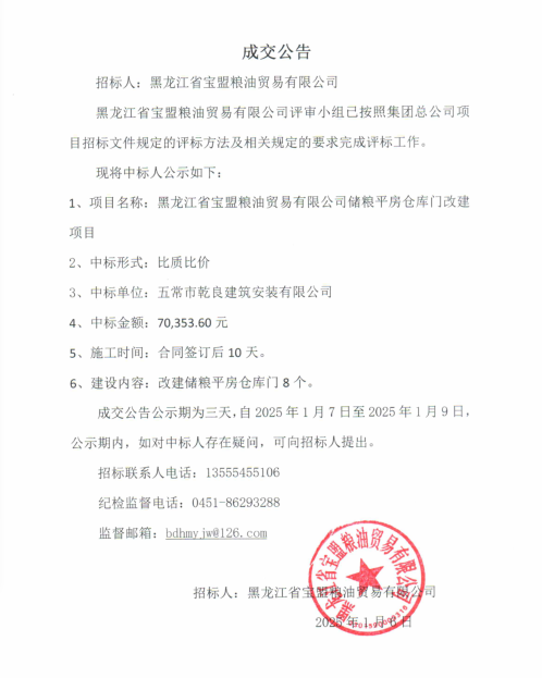 黑龍江省寶盟糧油貿(mào)易有限公司儲(chǔ)糧平房倉(cāng)倉(cāng)門改建項(xiàng)目中標(biāo)公告