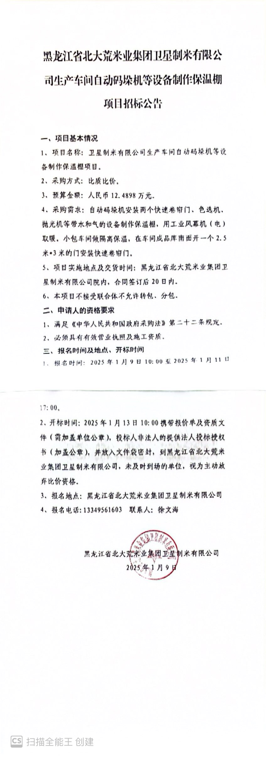 黑龍江省北大荒米業(yè)集團衛(wèi)星制米有限公司生產(chǎn)車間自動碼垛機等設備制作保溫棚項目招標公告
