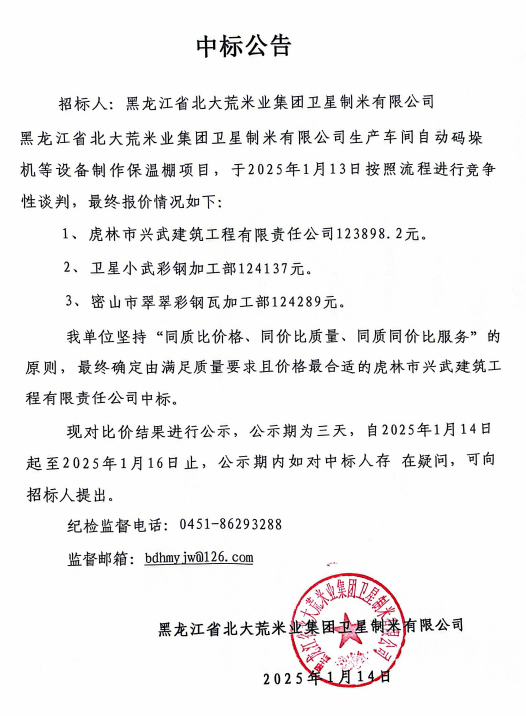 北大荒米衛(wèi)星公司生產(chǎn)車間自動(dòng)碼垛機(jī)項(xiàng)目中標(biāo)公告