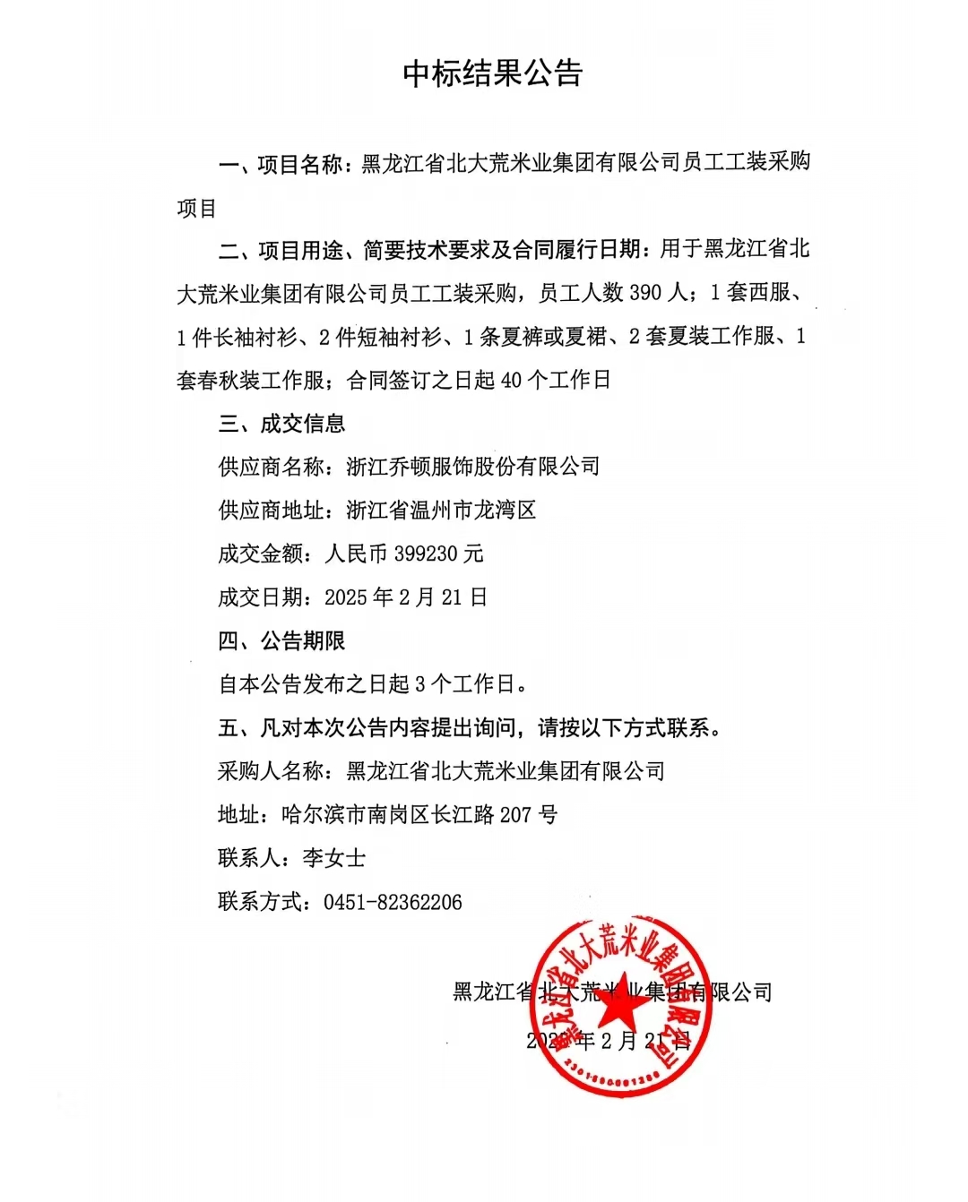 北大荒米業(yè)員工工裝采購中標(biāo)公告