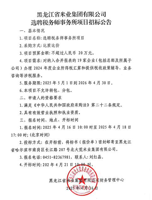 黑龍江省米業(yè)集團有限公司選聘稅務(wù)師事務(wù)所項目招標公告