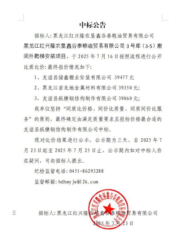 黑龍江紅興隆農(nóng)墾鑫谷泰糧油貿(mào)易有限公司3號(hào)庫(3-5)廒間外爬梯安裝項(xiàng)目中標(biāo)公告