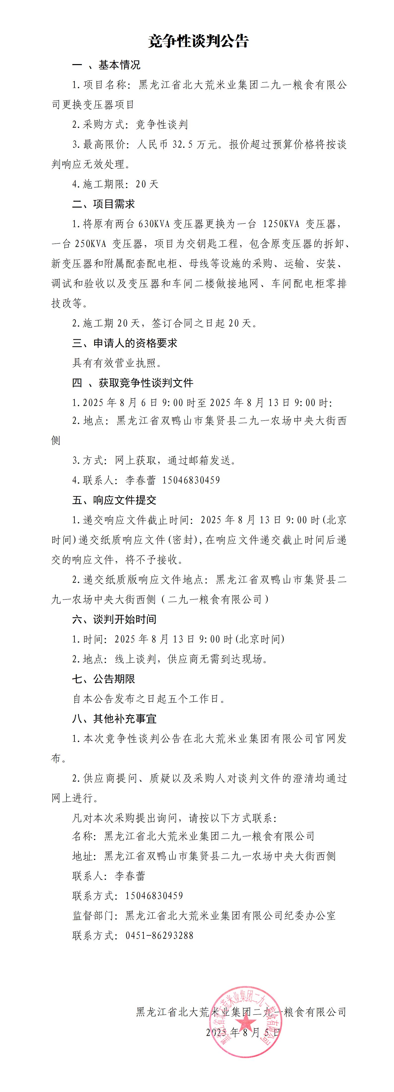 :黑龍江省北大荒米業(yè)集團(tuán)二九一糧食有限公司更換變壓器項目競爭性談判公告