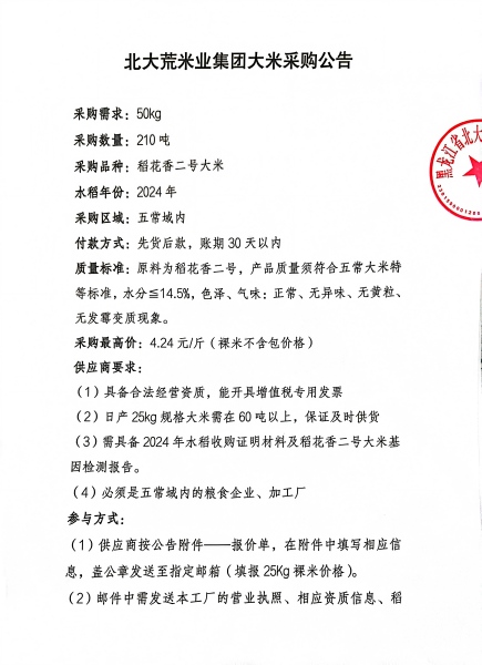 北大荒米業(yè)大米采購公告