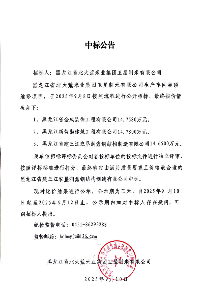 衛(wèi)星制米有限公司生產(chǎn)車間屋頂維修項目中標(biāo)公告