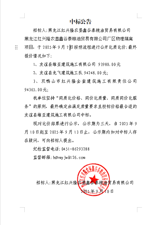 鑫谷泰糧油貿(mào)易有限公司廠區(qū)物理隔離項目中標公告