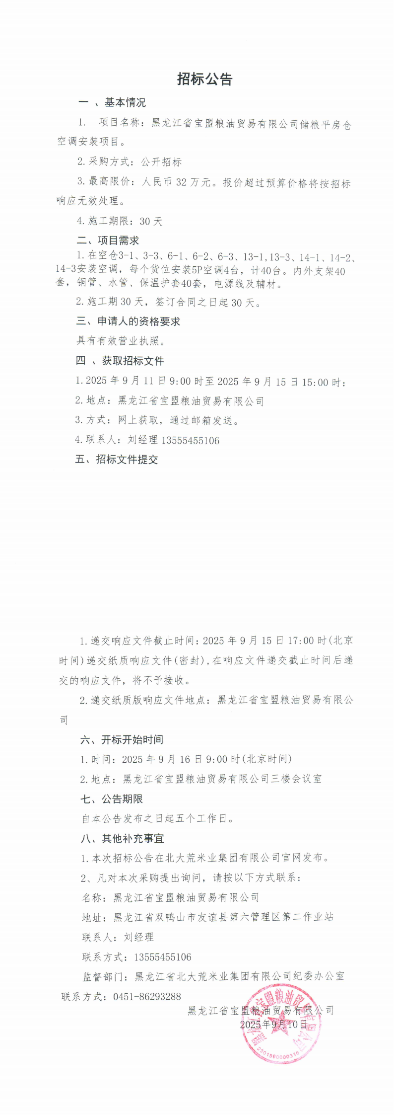 寶盟糧油貿(mào)易有限公司儲糧平房倉 空調(diào)安裝項目招標公告
