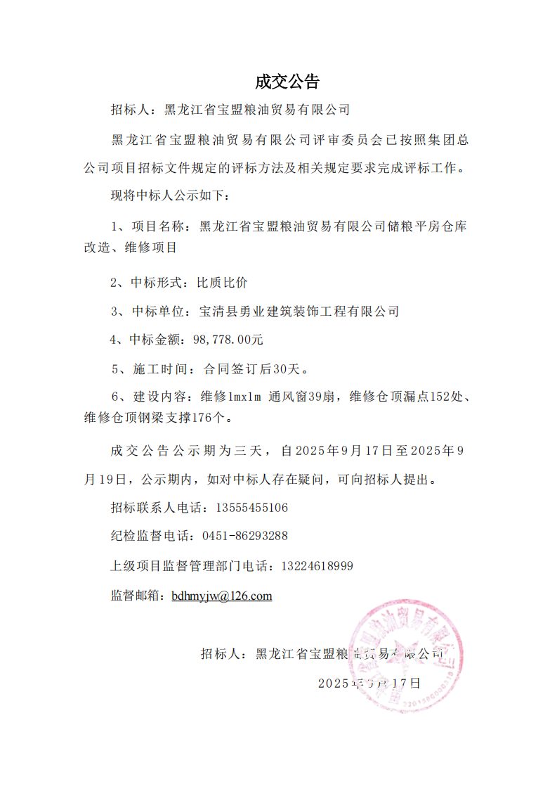 黑龍江省寶盟糧油貿(mào)易有限公司儲糧平房倉庫改造、維修項目中標公告