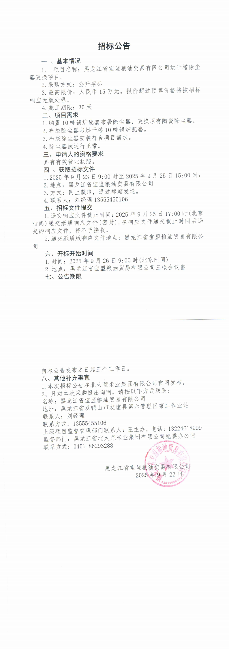 黑龍江省寶盟糧油貿(mào)易有限公司烘干塔除塵器更換項目招標(biāo)公告