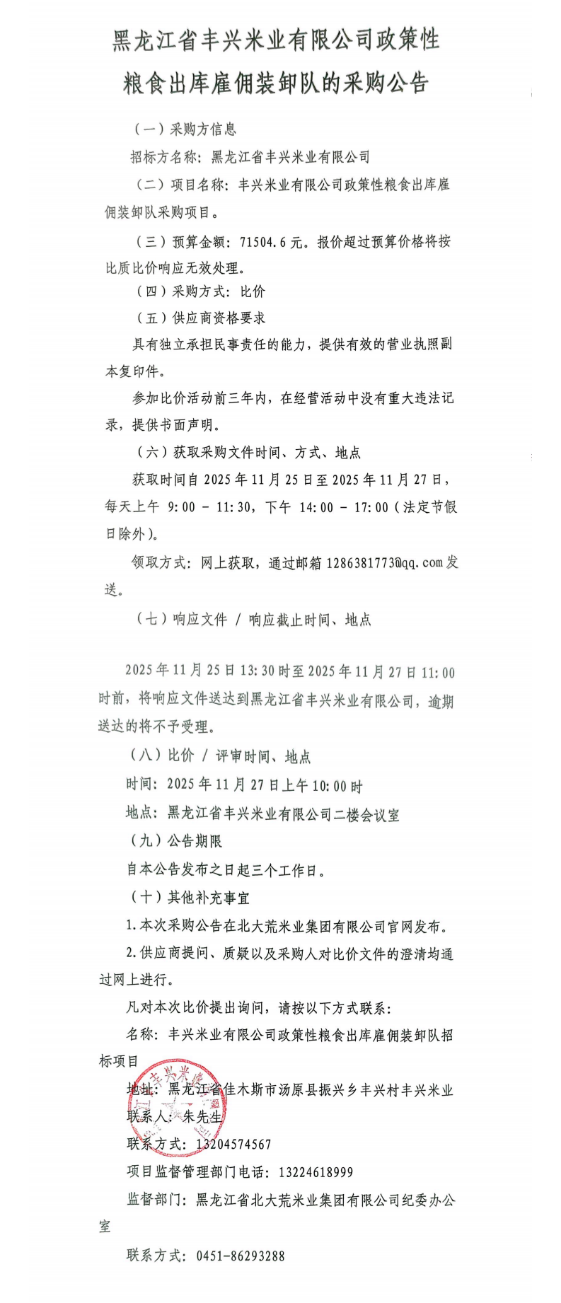 豐興米業(yè)政策性糧食出庫雇傭裝卸隊(duì)采購公告