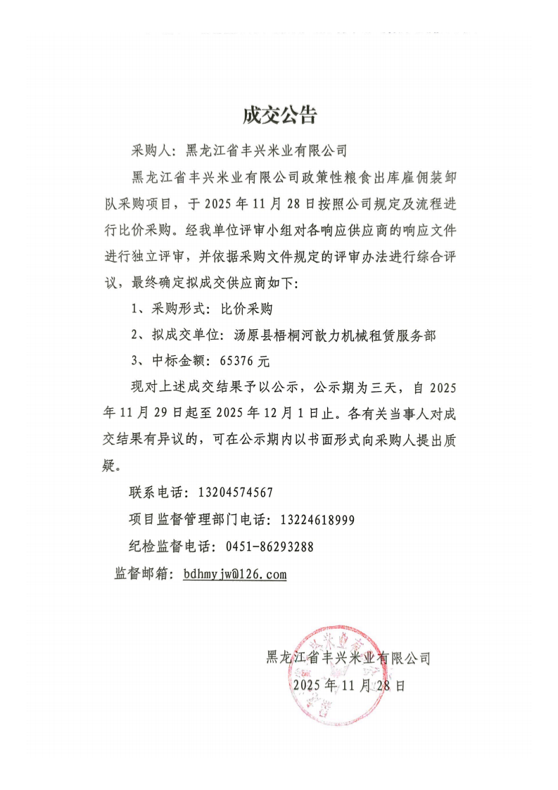 豐興米業(yè)政策性糧食出庫(kù)雇傭裝卸隊(duì)成交公告