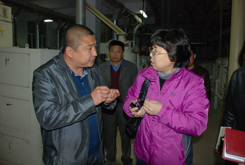 迎春制米公司總經(jīng)理劉燕華向《經(jīng)濟日報》社莫小民介紹出口米加工情況